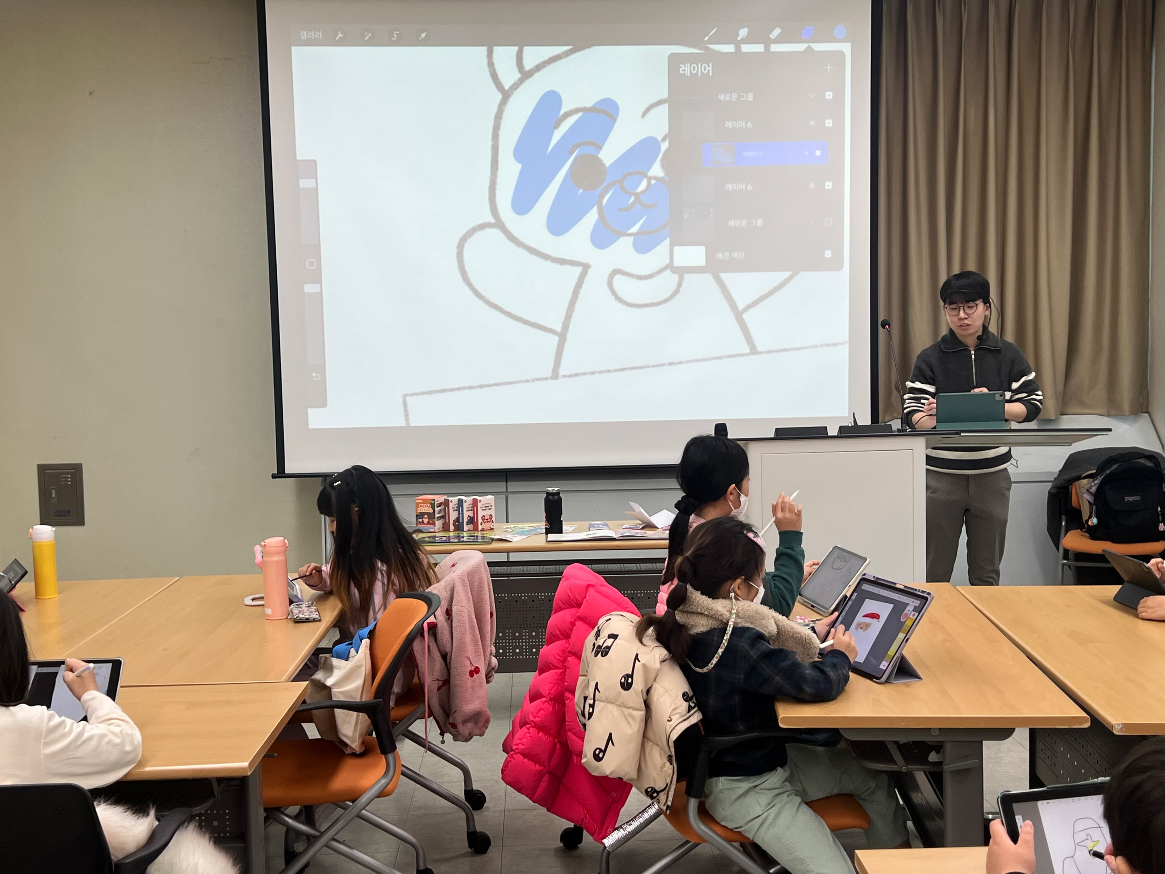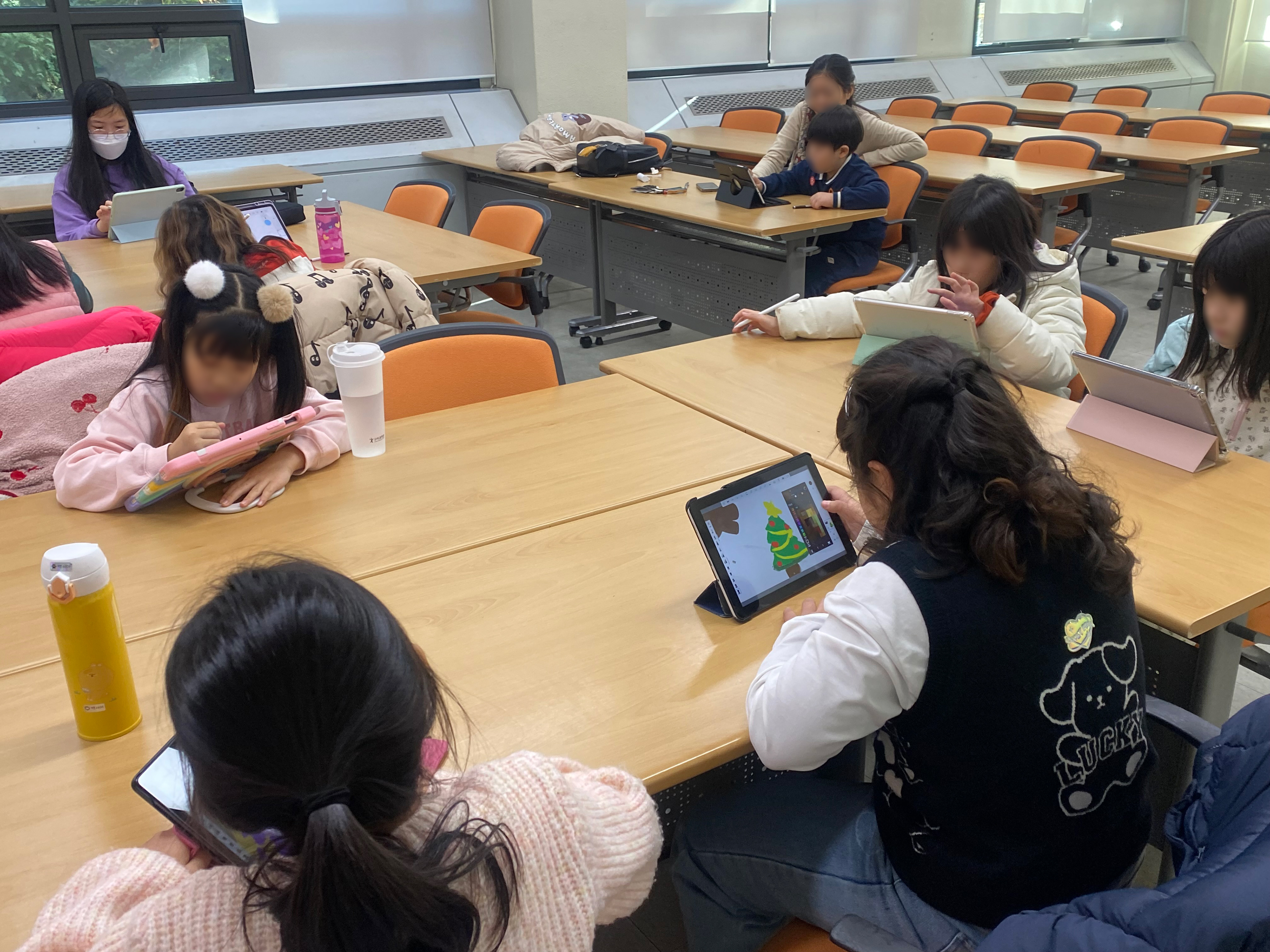 디지털 드로잉의 기초(레이어, 브러시, 지우개, 색 선택 등)를 가르치고, 간단한 크리스마스 그림을 그리는 방법 설명.