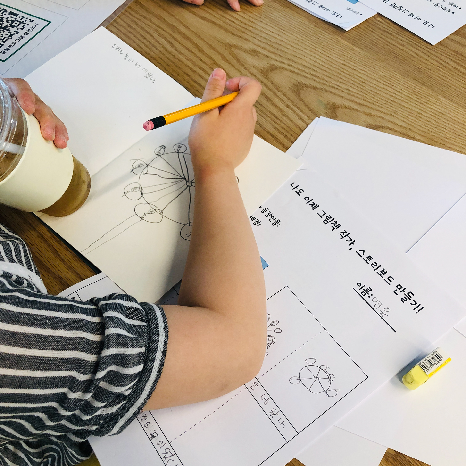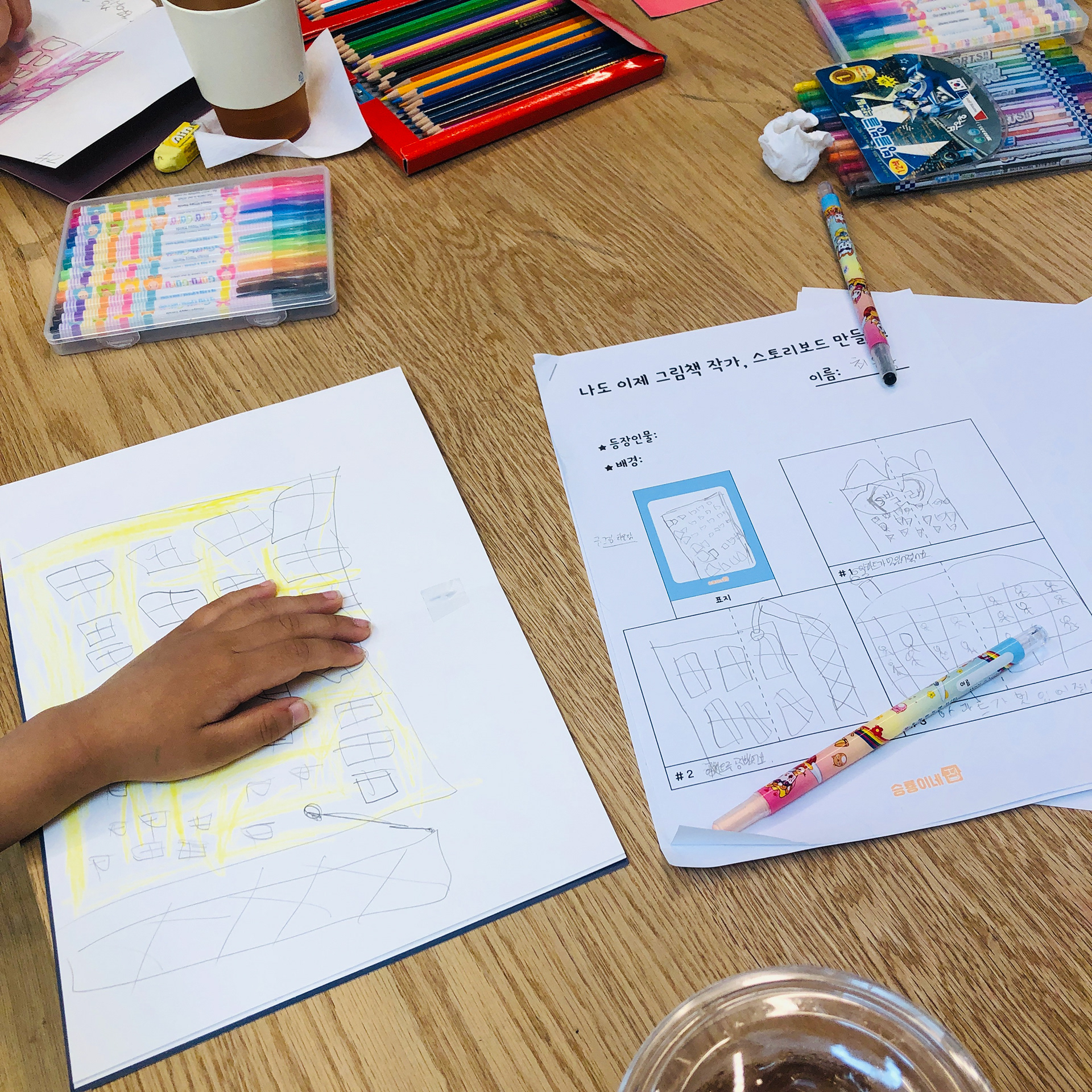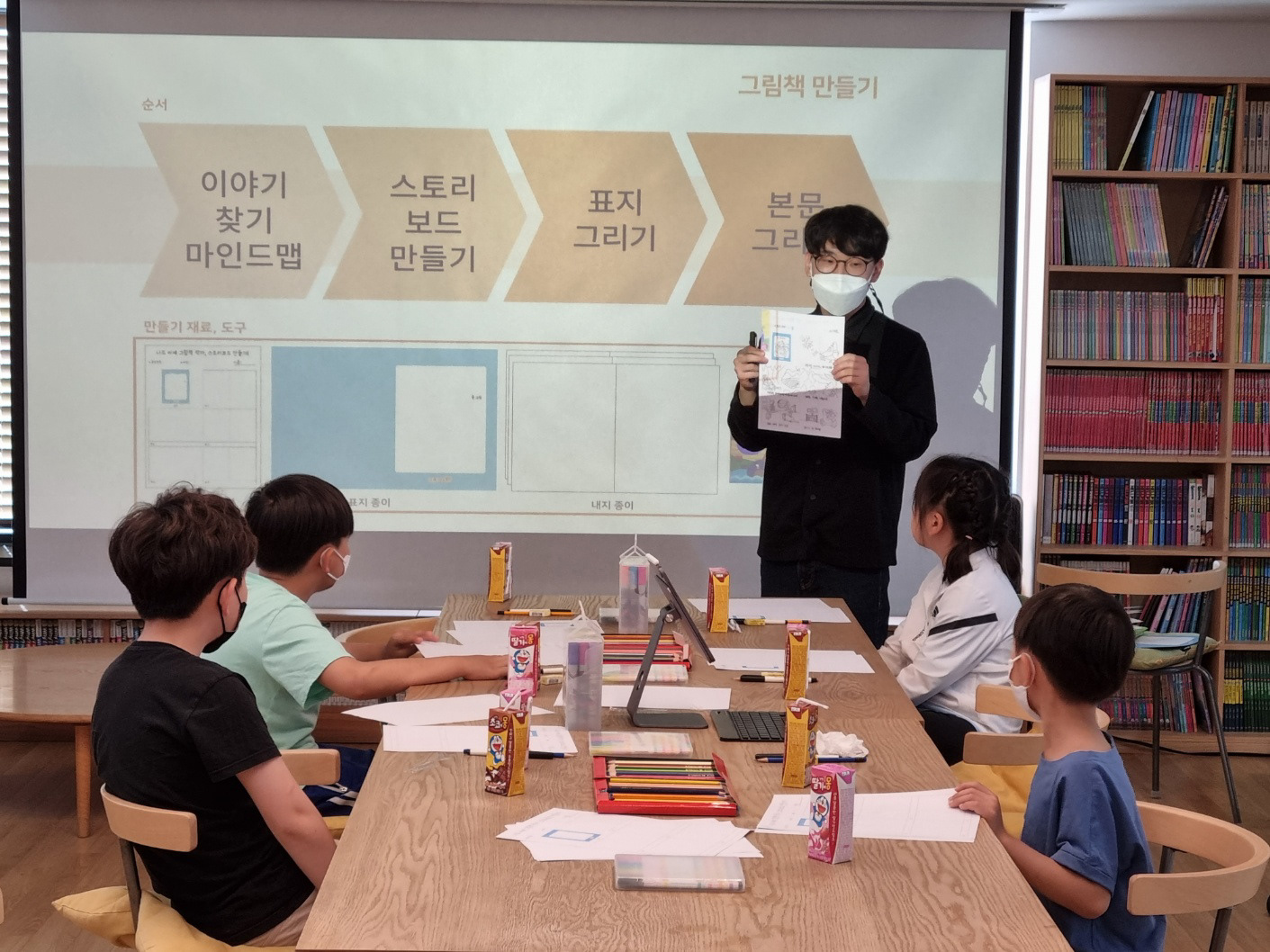 승룡이네집 문화 프로그램. 7세 이상 어린이 대상으로 <그림책 만들기 수업> 진행. 자신의 이야기를 담아 '세상에 하나뿐인 그림책'을 만드는 시간.